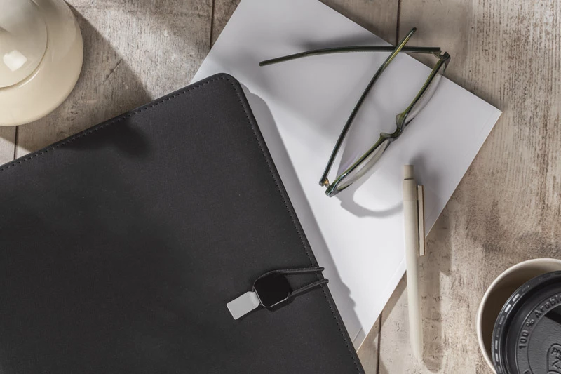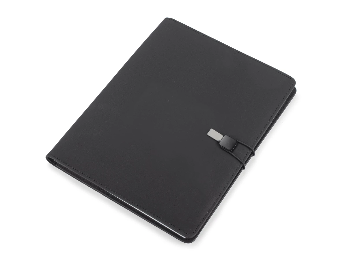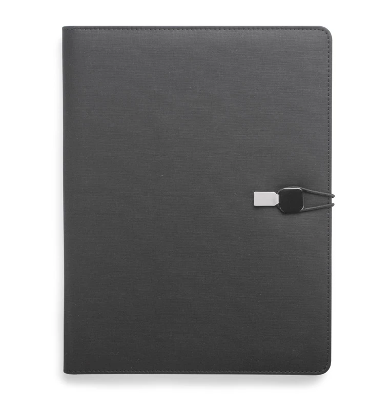 Teczka konferencyjna TELLA zamykana na gumkę zakończonąmateriałem skóropodobnym (PU) w kolorze szarym, która ułatwia otwieranie teczki i jednocześnie stanowi ciekawą i elegancka ozdobę . Zawiera jedną kieszeń do przechowywania dokumentów, dwie mniejsze kieszonki, miejsce na długopis i wizytówki oraz notes o formacie A4 z możliwością jego wymiany.