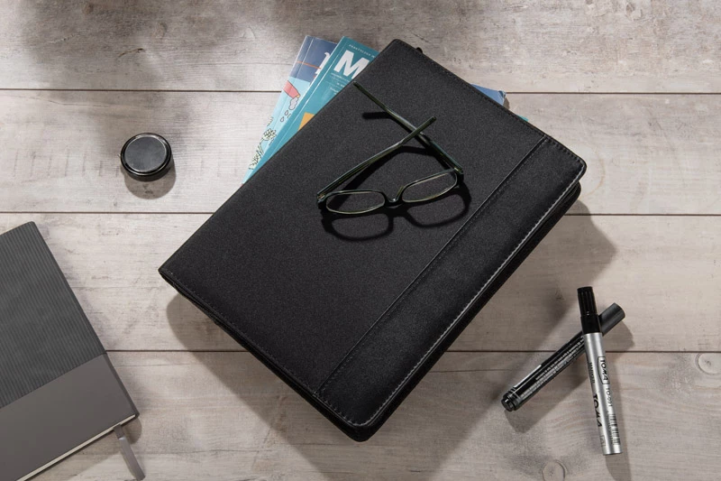 Teczka zapinana na zamek, wykonana z mikrofibry i poliestru 600D. Zawiera dużą kieszeń, kieszeń zapinaną na zamek, 2 miejsca do wpięcia USB, małe kieszonki, miejsce na długopis, notes. Notes nie jest umocowany na stałe, ale wsuwany w kieszonkę, dzięki czemu można go łatwo wymienić. Logo wygrawerujemy na teczce.