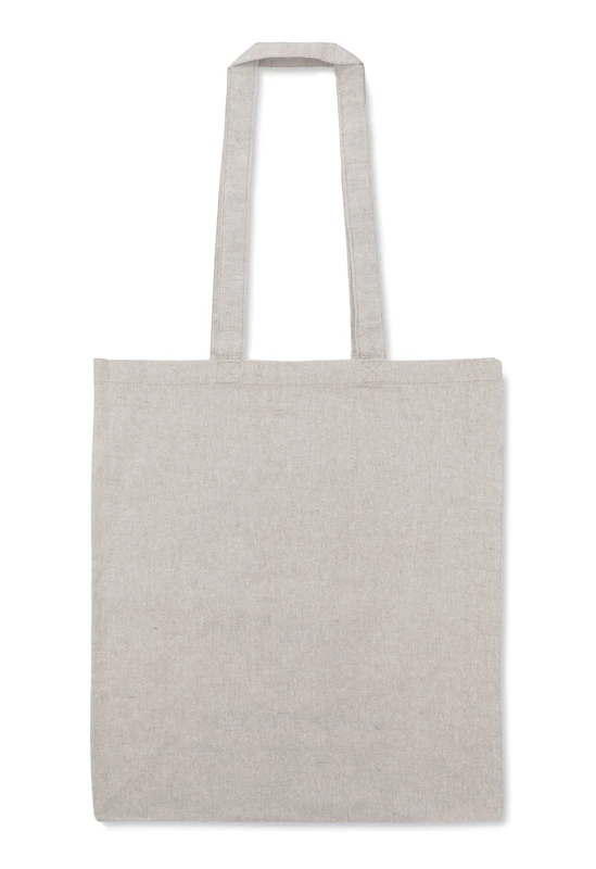 Torba MELANGE wykonana jest z bawełny pozyskanej z recyklingu, dzięki czemu oszczędność wody w procesie produkcyjnym jest znaczna. Posiada rączki o długości około 70 cm. Gramatura bawełny 140g/m2