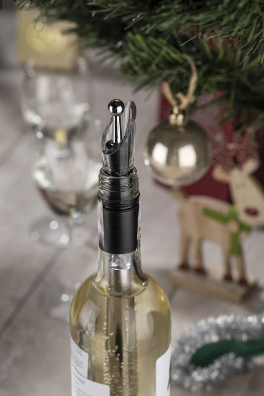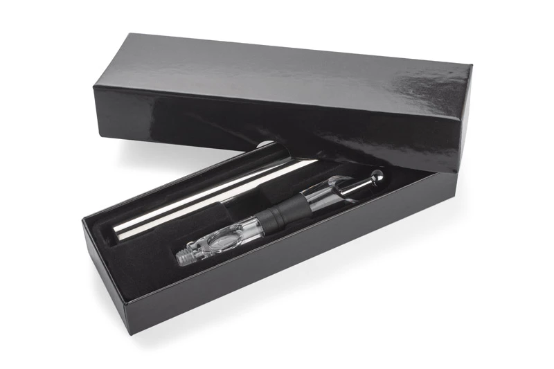 Prawdziwa gratka dla miłośników wina. Produkt skrywa wiele funkcji: utrzymuje odpowiednią temperaturę wina dzięki specjalnemu wkładowi chłodzącemu, napowietrza wino uwalniając jego aromaty dzięki ukrytemu w nalewaku aeratorowi, umożliwia zachowanie wszystkich aromatów w butelce poprzez zamykany korek. Odkręcany wkład chłodzący należy przed użyciem umieścić w zamrażalniku. Wszystkie elementy zapakowane w eleganckie czarne pudełko.