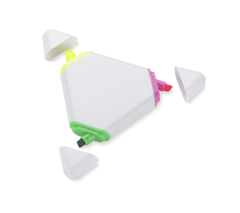 Zakreślacz w formie trójkąta. Wygodny i praktyczny. Posiada trzy kolory zakreślacza: żółty, zielony i różowy. Logo nanosimy na powierzchnię zakreślacza metodą tampodruku.