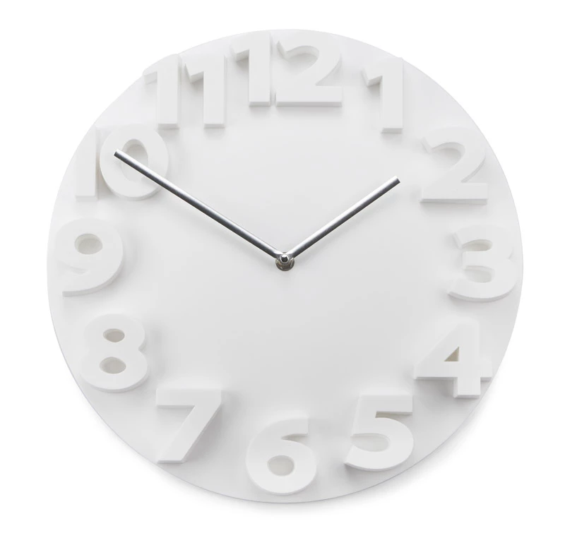 Duży zegar o nowoczesnym wyglądzie. Dzięki wypukłym cyfrom godzina jest bardzo dobrze widoczna.