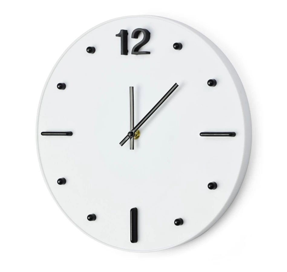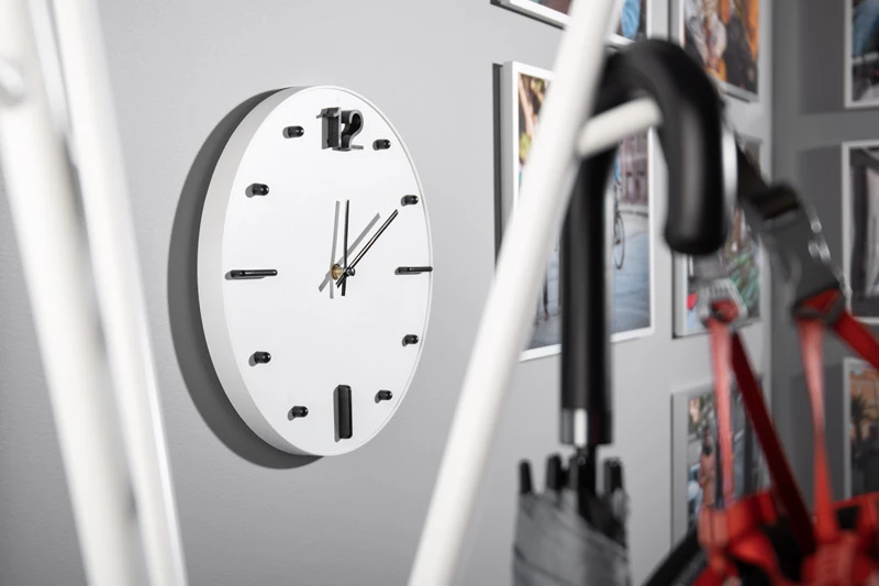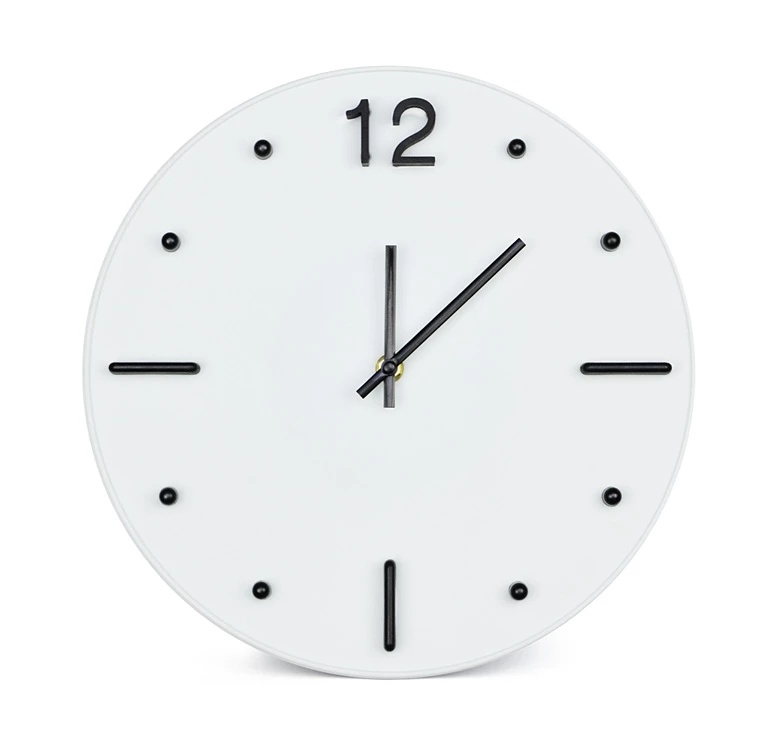 Duży zegar ścienny o nowoczesnym wyglądzie. Kontrast czarnych wskazówek na białej tarczy pozwala na bezproblemowe odczytanie godziny. Logo nadrukujemy na tarczy zegara. Baterie nie są dołączone - wymaga AA x 1 szt.