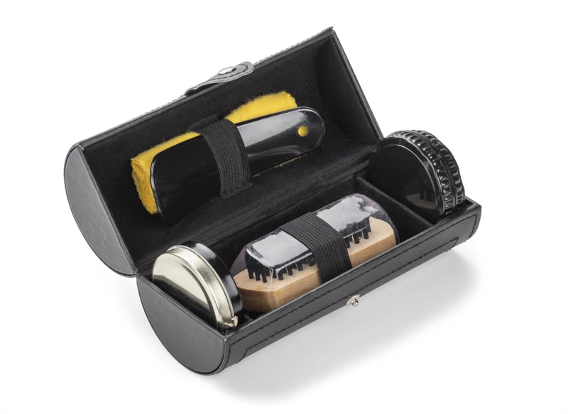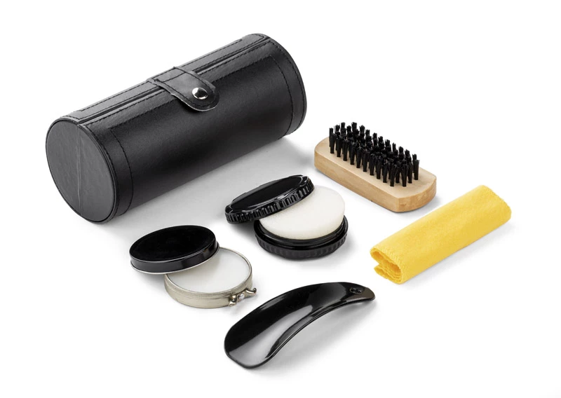 Wszechstronny zestaw do czyszczenia obuwia wykonany z materiału skóropodobnego (PU). Zawiera pastę bezbarwną, czyścik, łyżkę do butów, ściereczkę i szczotkę. Logo umieścimy na tubie.