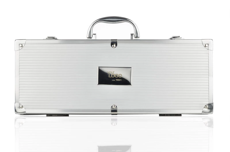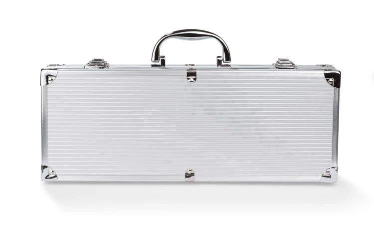 Zestaw do grilla pakowany w walizkę: szczypce, łopatka, nóż, widelec i pędzelek.