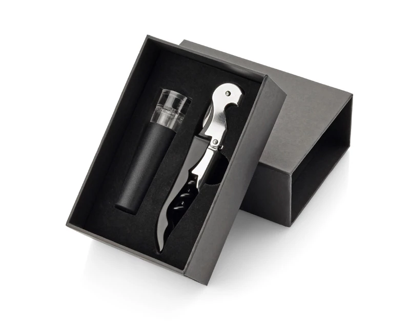 Dwuelementowy, elegancki zestaw do wina zawiera próżniowy korek oraz korkociąg. Próżniowy korek z pompką zasysającą powietrze z butelki pozwala na dłuższe przechowywanie otwartego wina bez utraty cennych aromatów. Zestaw jest zapakowany w eleganckie czarne pudełko.