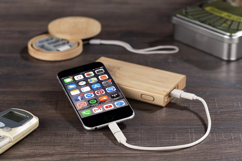 Zestaw kabli MIJATO do ładowania w stylowym okrągłym opakowaniu wykonanym z bambusa. Kable posiadają funkcje zarówno ładowania jak i przesyłu danych. Zestaw zawiera 4 typy końcówek: USB typ C, USB, micro USB oraz adapter kompatybilny z urządzeniami iOS. Wykonane są ze słomy pszenicznej.