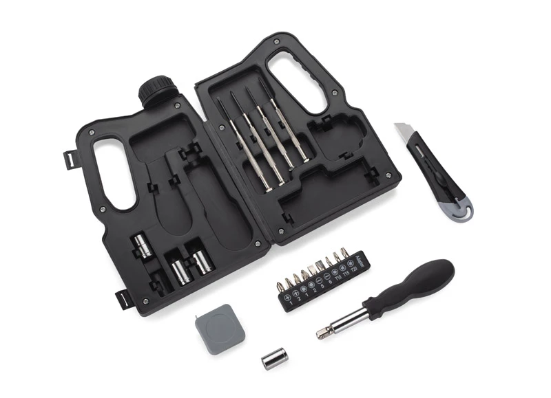 KANNIS to zestaw, w którym znajduje się wiele przydatnych narzędzi: cztery śrubokręty precyzyjne, nożyk do tapet, zwijana miara, uchwyt, cztery klucze nasadkowe z przejściówką i dziewięć bitów. Wszystko razem zamknięte jest w charakterystyczne etui w kształcie kanistra.