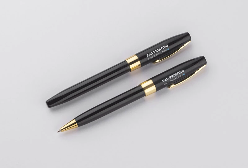 Komplet piśmienniczy ARIZONA ze złotymi wykończeniami pakowany jest w eleganckie etui wykonane z czarnego weluru. W zestawie znajduje się długopis z niebieskim wkładem oraz pióro kulkowe (rollerball) z czarnym wkładem. Logo grawerujemy w kolorze złotym na górnej części obu elementów zestawu, co nadaje im spójny i prestiżowy charakter.