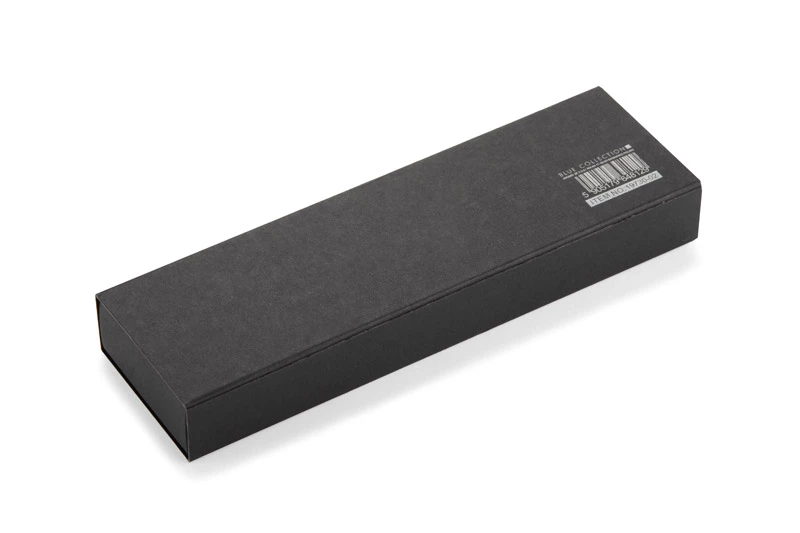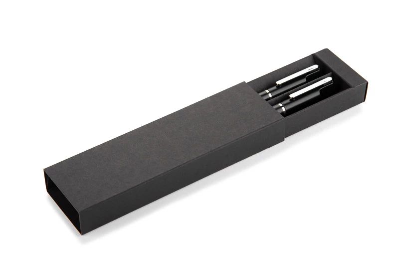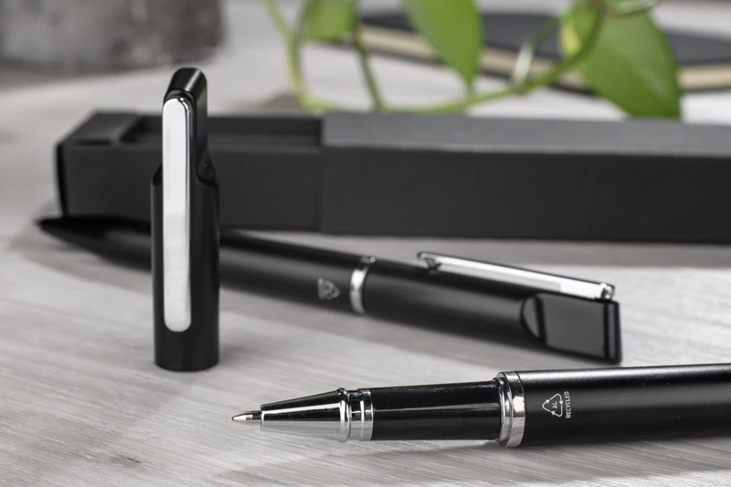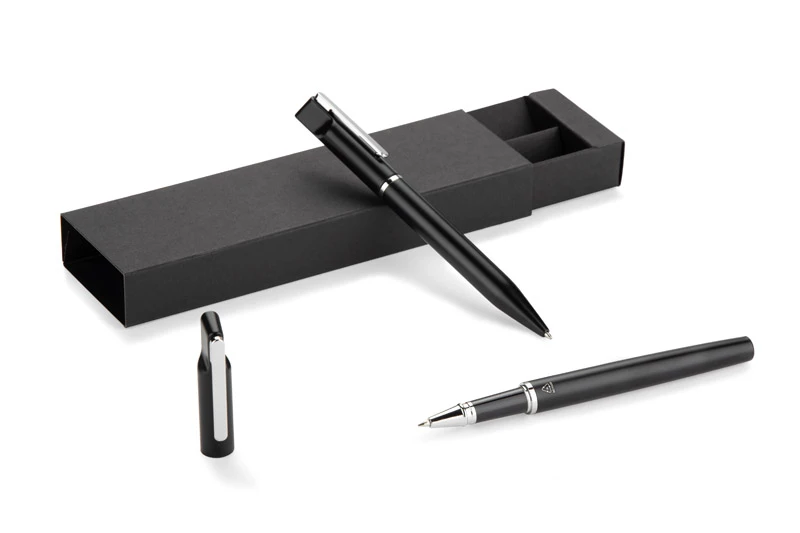 Zestaw piśmienniczy EFAN to stylowy komplet składający się z długopisu oraz pióra kulkowego, wykonanych z recyklingowanego aluminium. Oba elementy mają smukłą, czarną konstrukcję z matowym wykończeniem i subtelnymi srebrnymi detalami. Długopis wyposażony jest w niebieski wkład, a pióro kulkowe w czarny, oba o grubości pisania 1,0 mm i długości do 500 metrów. Całość zapakowana w czarne kraftowe pudełko papierowe.