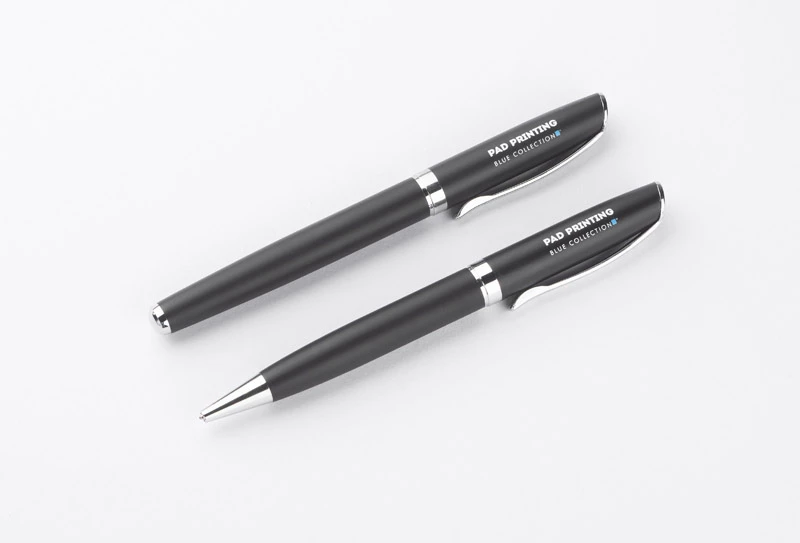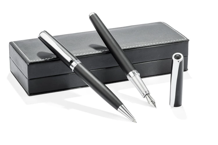 GEORGIA to elegancki zestaw piśmienniczy składający się z długopisu oraz pióra wiecznego. Przybory piśmiennicze wykonane z metalu zapakowane są w etui z czarnego materiału skóropodobnego (PU). Długopis z mechanizmem typu twist. Do pióra wiecznego dołączony jest jeden nabój z atramentem. Wkład długopisu oraz atrament naboju do pióra w kolorze czarnym.Pakowany w czarny kartonik lub biały rękaw.