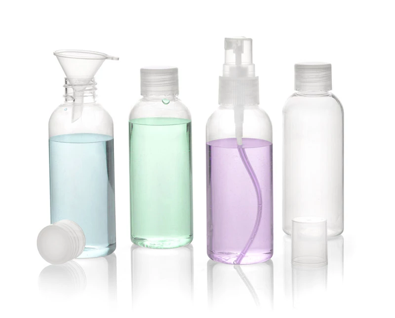 Zestaw podróżnych pojemników to gadżet przydatny w czasie podróży. Pozwala na zabranie swoich ulubionych kosmetyków w mniejszych buteleczkach. Zestaw zawiera 4 buteleczki o pojemności 80 ml, w tym jedną ze spryskiwaczem oraz lejek ułatwiający przelewanie kosmetyków.