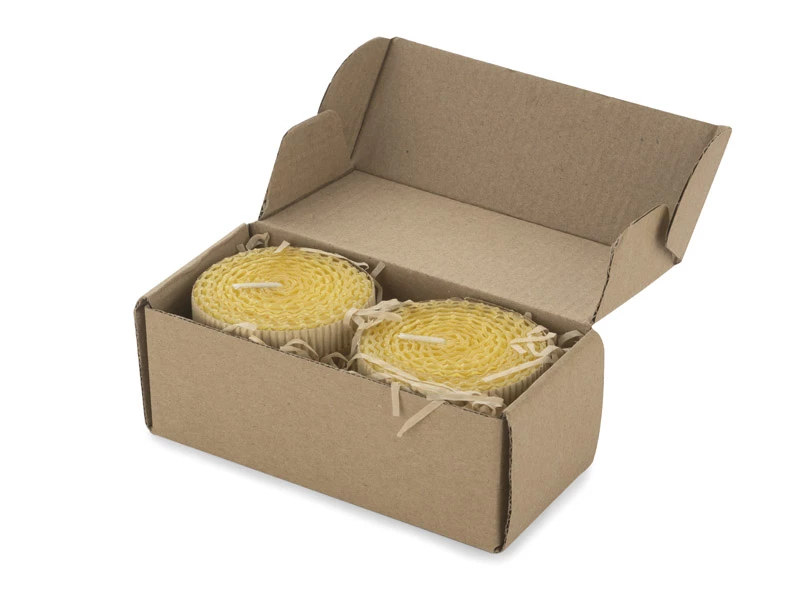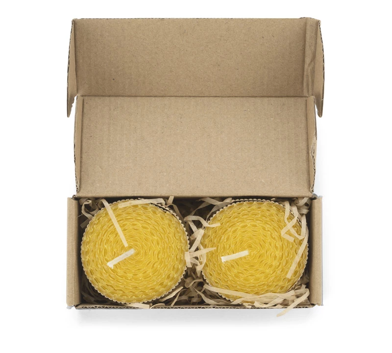 Zestaw 2 świec wykonanych z naturalnego wosku pszczelego to idealny upominek dla osób ceniących romantyczny nastrój w wersji eko. Świece spakowane w kartonik z tektury wypełniony ozdobnym siankiem ekologicznym. Każda świeca ozdobina kokardą z rafii.