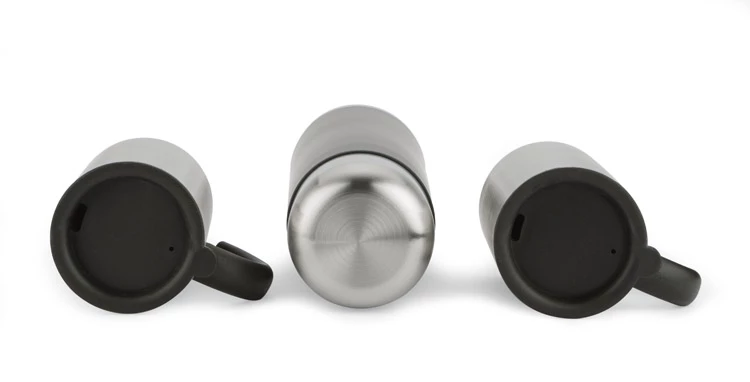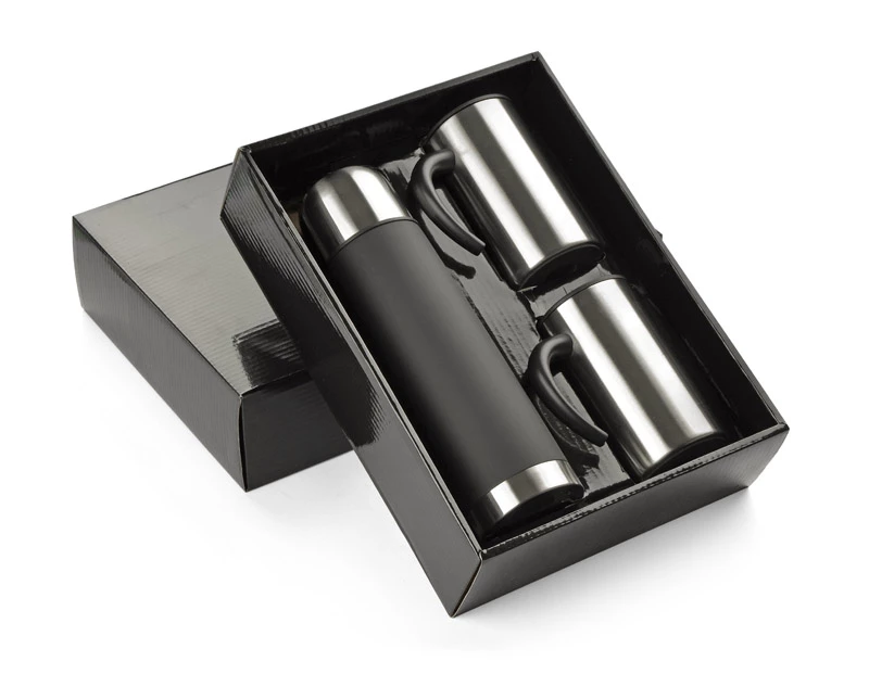 Termos ze stali nierdzewnej o pojemności 500 ml wraz z nakrętką-kubeczkiem o pojemności 90 ml oraz dwa kubki termiczne o pojemności 260 ml. Zestaw niezbędny w każdej podróży, pakowany jest w czarny kartonik. Logo grawerujemy na powierzchni kubków i termosów.
