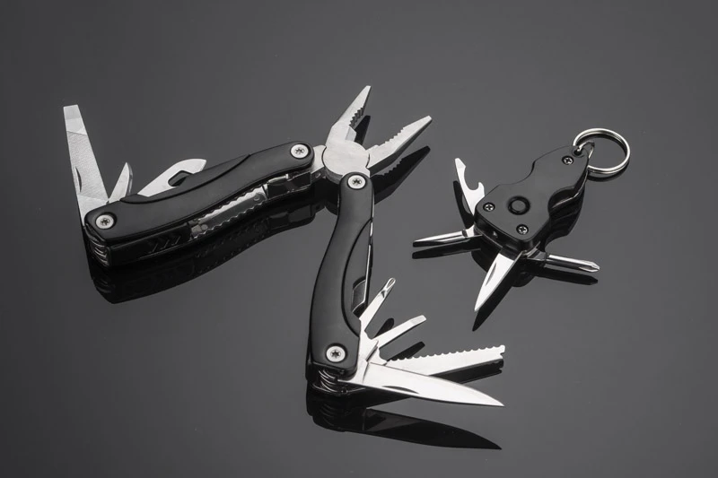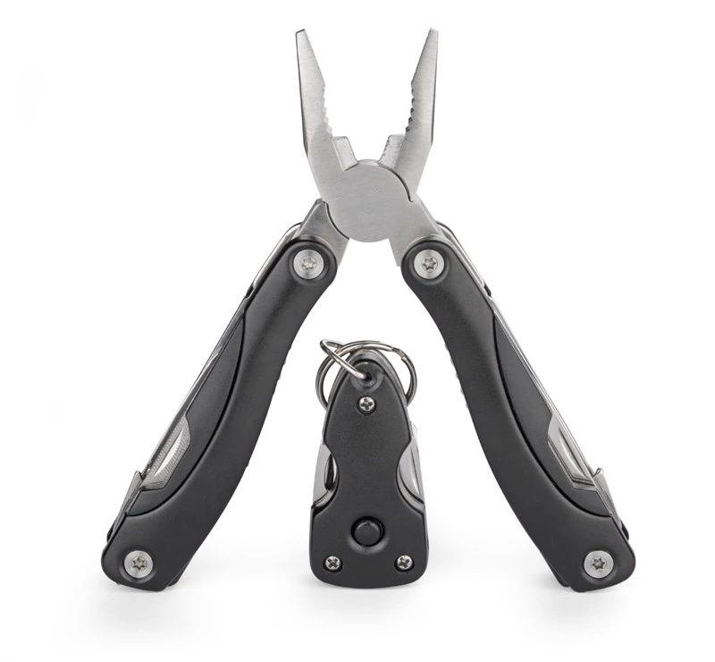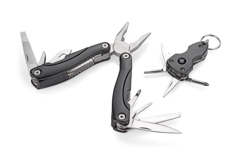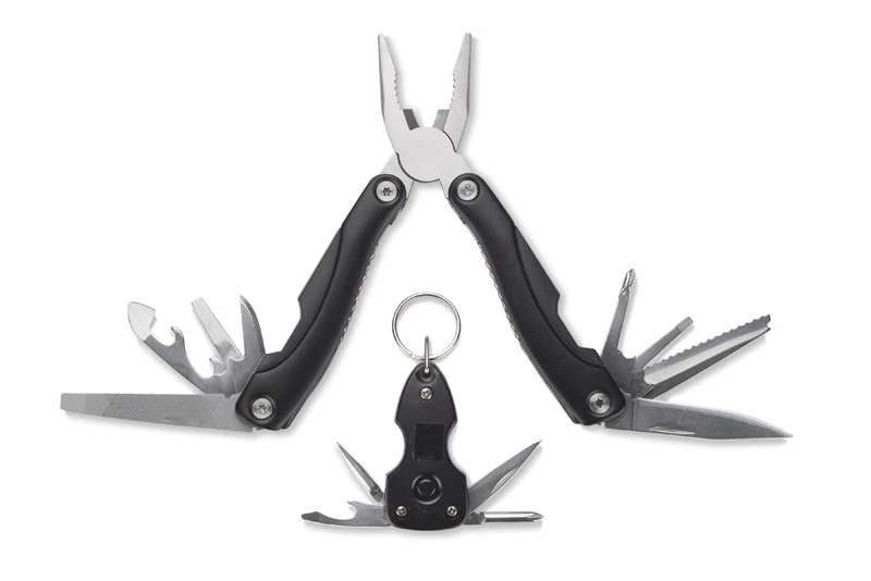 TOOL to zestaw składający się z narzędzia wielofunkcyjnego i breloka narzędziowego. Funkcje narzędzia: kombinerki, przecinak, nóż o gładkim ostrzu, piła, śrubokręt płaski i krzyżowy, pilnik, otwieracz do puszek i butelek. Wyposażony w blokadę wszystkich elementów. Funkcje breloka: nóż, śrubokręt płaski i krzyżowy, otwieracz do butelek, latarka. Oba gadżety zapakowane zostały w ekologiczne, kartonowe pudełko. Wymiary narzędzia wielofunkcyjnego 158 x 68 x 23 m, wymiary breloka 30 x 60 x 18 mm